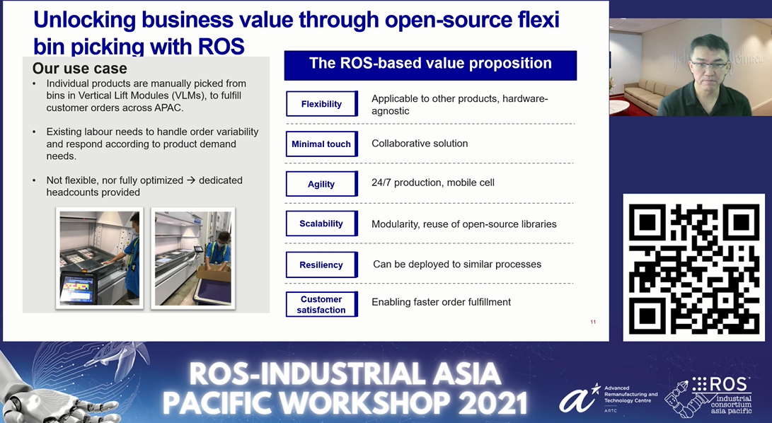 Shortly after, Nicholas Yeo, Senior Director of Advanced Technology, Asia Pacific, in Johnson & Johnson, shared that they are calling forward like-minded partners to collaborate and support their effort in realising the value in advancement in robotics to drive agility and resiliency in their supply chain environment. He then shared their early successes, strategies and approaches towards developing a successful framework using open-source technologies.